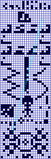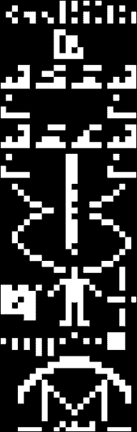 Dette signal bestod af 1679 impulser på to skiftende radiofrekvenser, som her er tegnet med de binære tal 0 og 1. Skal man gange to hele tal sammen for at få 1679, må det være 23 X 73, og derfor svarer 1679 til en visuel graf med 23 rækker gange 73 rækker. Tegner man 0'erne sorte, får man følgende tegning, og det var astronomernes oprindelige hensigt.