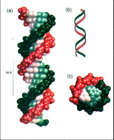 Den ejendommelige W-formede DNA streng til venstre for tallet har kun 6 trapper per "etage", i stedet for 10 som hos os. (Tæl de grupper af sorte firkanter diagonalt fra fyrens øreområde frem til den næste "etage", hvor mønstrene gentager sig.) Hvad kender man til DNA-strukturer med kun 6 trapper?