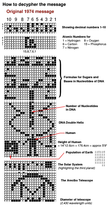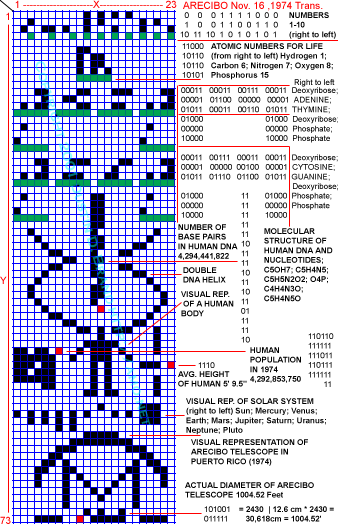 Den lange, lodrette serie af firkanter i to kolonner i midten af grafen, der strækker sig igennem sektion 3 og 4, er nummeret på det antal underafdelinger (kaldet "nucleotider"), der findes i en enhed af vores DNA. Der er ikke så få: 4,3 milliarder. Det interessante er, at i 1974 troede verdens videnskabsmænd, at der kun var omkring 1 milliard af disse, men den topastronom og ekspert i liv udenfor jorden ("exobiologi"), Carl Sagan, som var hoveddesigner af både guldpladen og radiosignalbeskeden, udsendte netop dette præcise, meget højere og på den tid ukendte tal. Hvor fik han tallet fra dengang? Hans tal er endnu højere end de ca. 3,5 milliarder, som DNA kortlæggerne per 2002 er nået frem til.